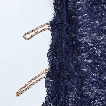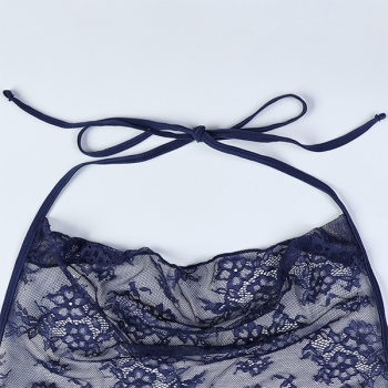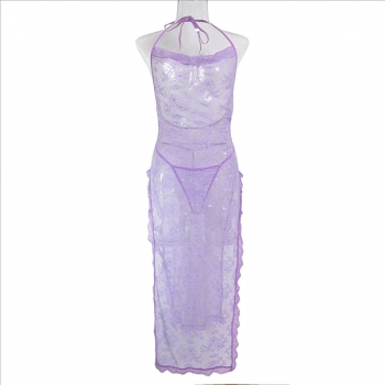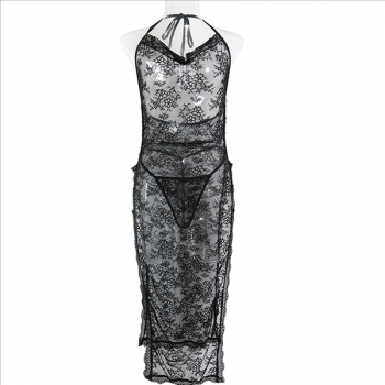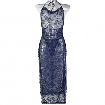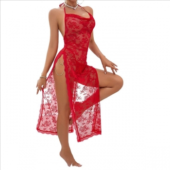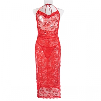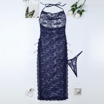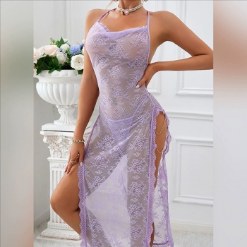 Sexy Halter Neck Side Slit Backless Floral Jacquard Semi-through Lace Nightwear Dress