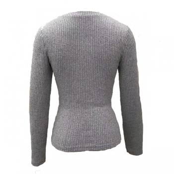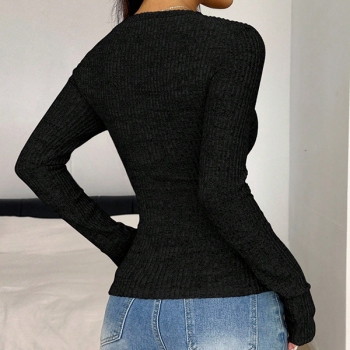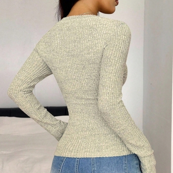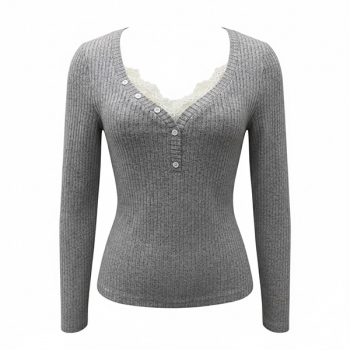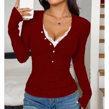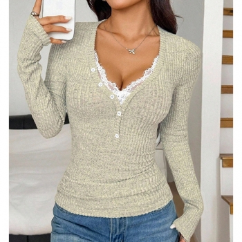 Sexy Lace Spliced Button V-neck Long Sleeve Ribbed Shirt