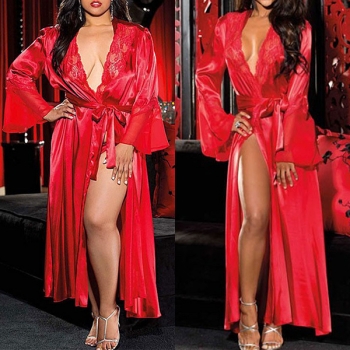 Sexy Lace Spliced Long Sleeve Self-tie Maxi Robe