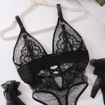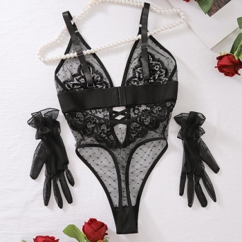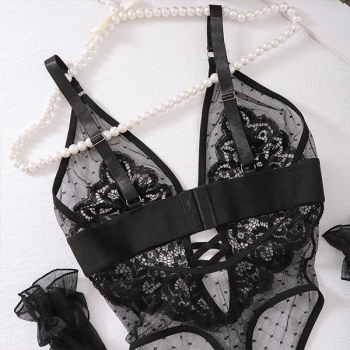 Sexy Mesh Net Lace Spliced V-neck Lingerie Bodysuit