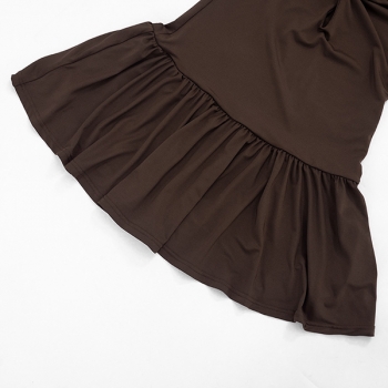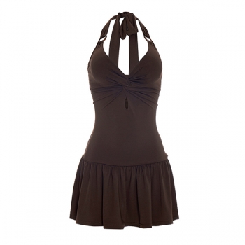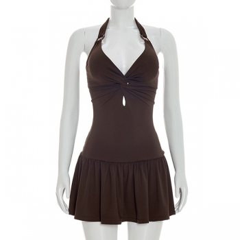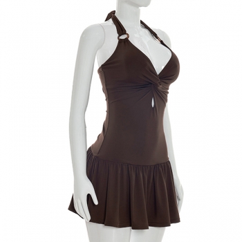 Sexy O-ring Knit-knot Front Cutout Ruffle Hemline Backless Mini Dress