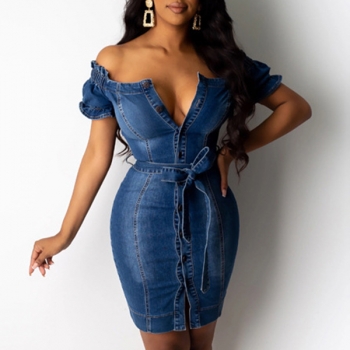 Sexy Off-shoulder Boat Neck Short Sleeve Slim Fit Denim Dress