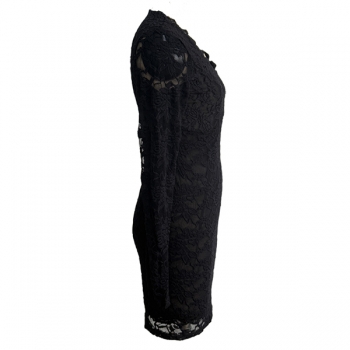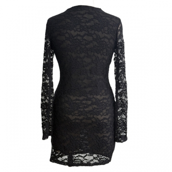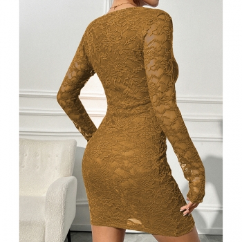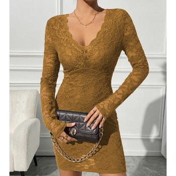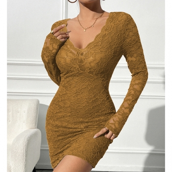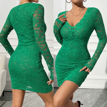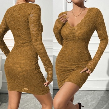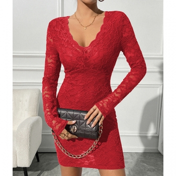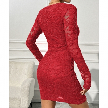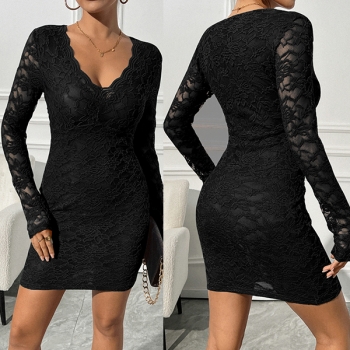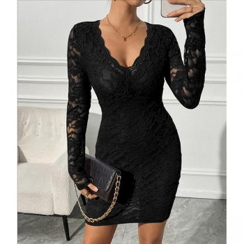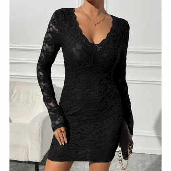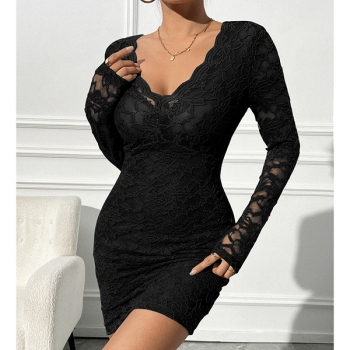 Slim-Fit Long-Sleeve V-Neck Dress with Lace Detail