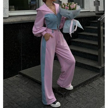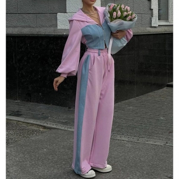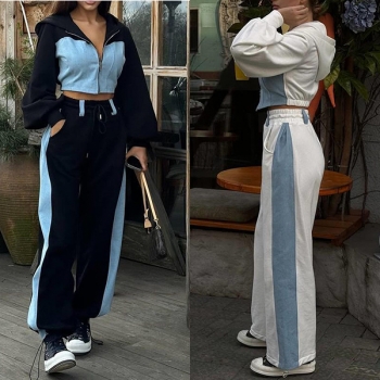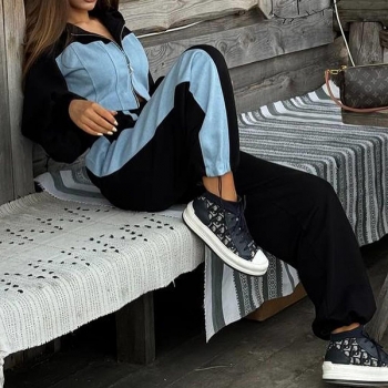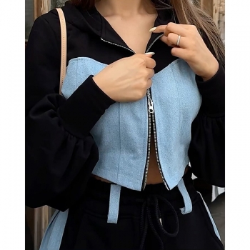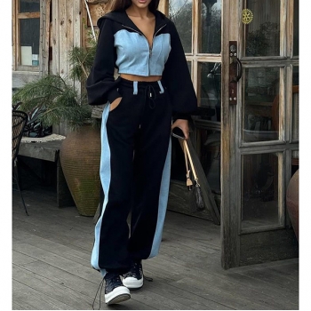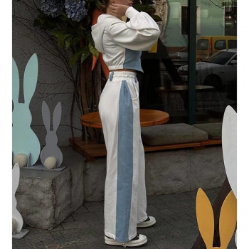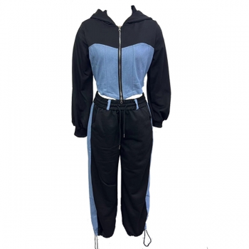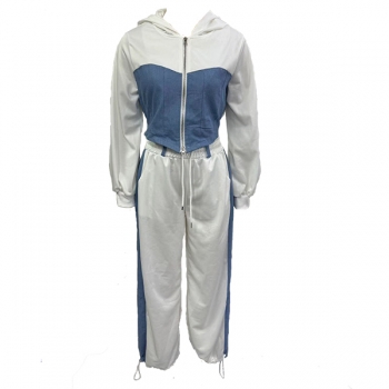 Street Fashion Denim Spliced Two-piece Set Consist of Crop Hooded Sweatjacket and Drawstring Sweatpants