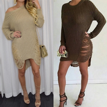 Stylish Solid Color Round Neck Long Sleeve Hollow Out High-low Hemline Sweater Dress