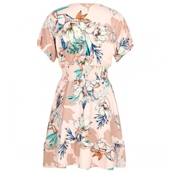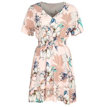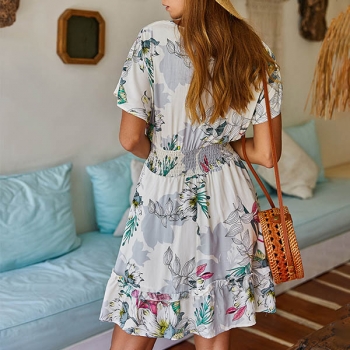 Sweet Style Short Sleeve V-neck High Waist Printed Dress