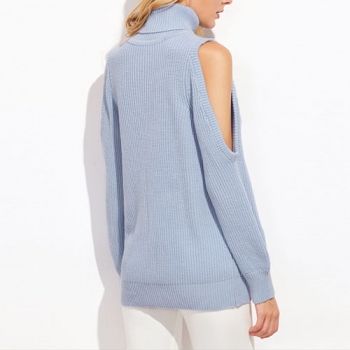 Trendy Solid Color Long Sleeve Turtleneck Cold Shoulder Sweater