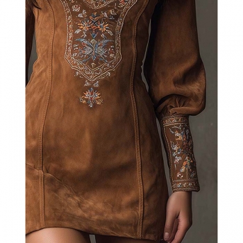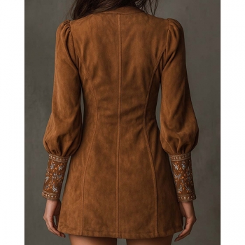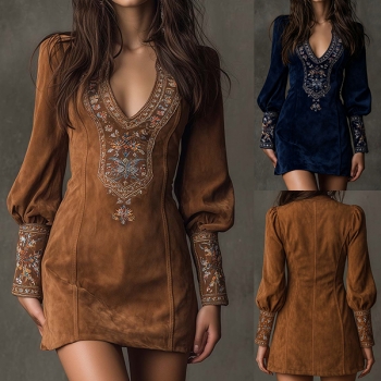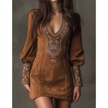 Vintage Floral Embroidery V-neck Puff Long Sleeve Artificial Suede Mini Dress