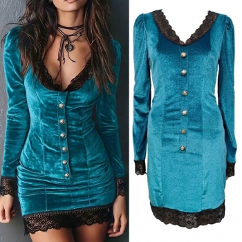 Vintage Lace Spliced V-neck Front Button Long Sleeve Bodycon Dress