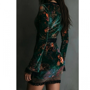 Vintage Lace Spliced V-neck High-rise Floral Printed Bodycon Dress