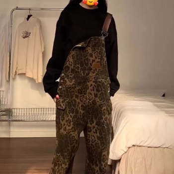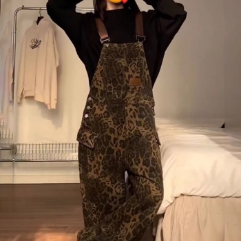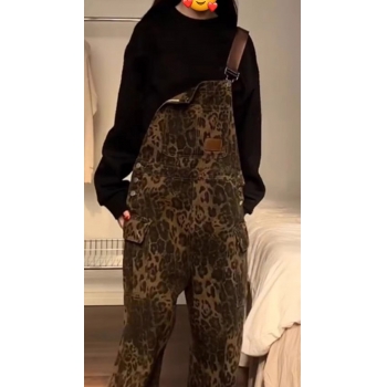 Vintage Leopard Printed Front Patch Pockets Loose Suspender Jumpsuit