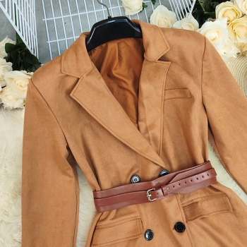 Vintage Notch Lapel Long Sleeve Double-breasted Artificial Suede Jacket with Belt
