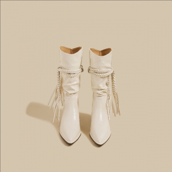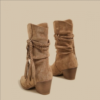 Vintage Pointed-toe Block Heeled Braided Tassel Artificial Suede Boots