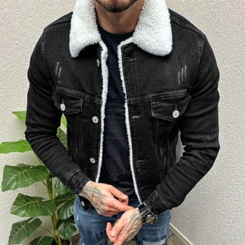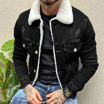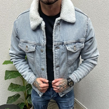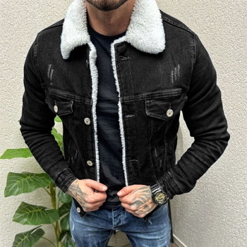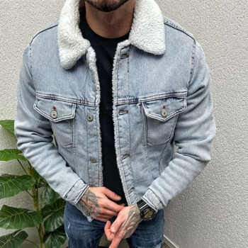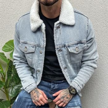 Vintage Stand Collar Long Sleeve Plushed Lined Old-washed Denim Jacket for Men