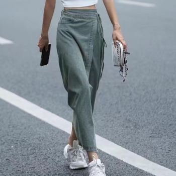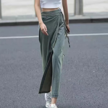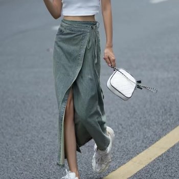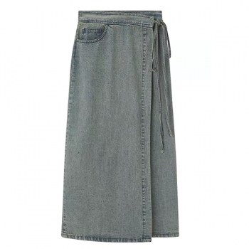 Vintage Tint Denim Maxi Skirt - High Waisted Wrap Tie-Side Split Jean Skirt Y2K Grunge