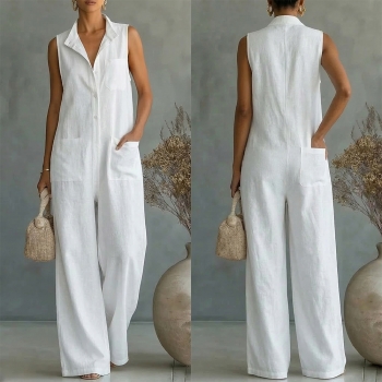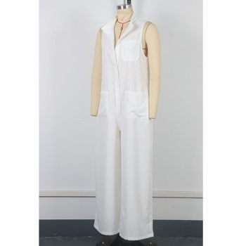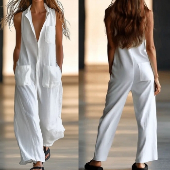 White Relaxed Fit Utility Jumpsuit - Sleeveless Wide Leg with Patch Pockets