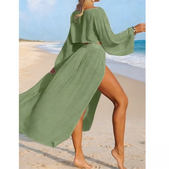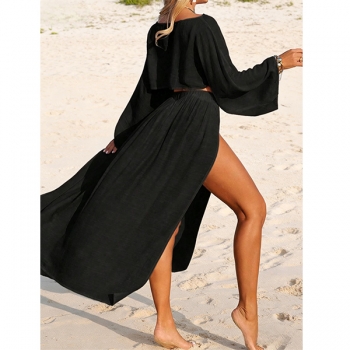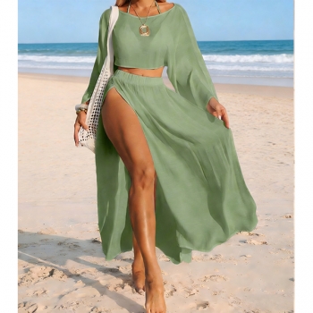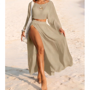 Women's 2 Piece Beach Cover Up Set - Sheer Long Sleeve Crop Top & High Slit Maxi Skirt Swimwear Coverup