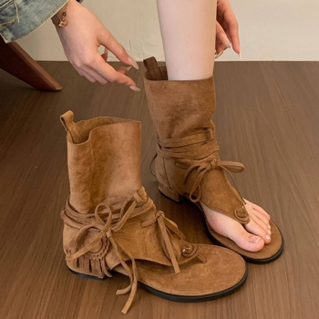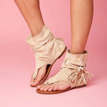 Women's Boho Flat Ankle Boot Sandals Faux Suede Fringe Tassel Thong Gladiator Shoes