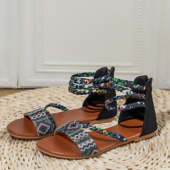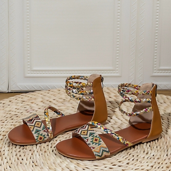 Women's Boho Tribal Woven Flat Sandals - Colorful Braided Strappy Gladiator Shoes with Back Zipper