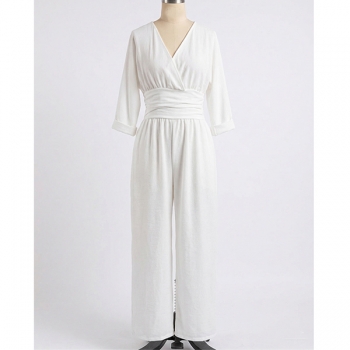 Women's Boho Wide Leg Jumpsuit - V Neck Batwing Sleeve High Waisted Summer Romper with Pockets