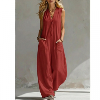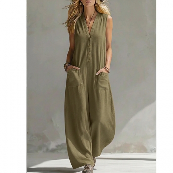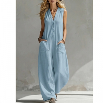 Women's Casual Sleeveless Wide Leg Jumpsuit - Boho V-Neck Loose Romper Overalls with Pockets
