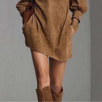 Women's Faux Suede Mini Dress - Half-Zip Stand Collar Lantern Sleeve Shift Dress with Pockets