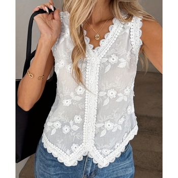 Women's V-Neck Sleeveless Button-Down White Floral Embroidered Lace Vest Top