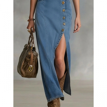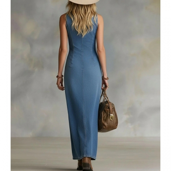 Women's Vintage Denim Midi Dress-Sleeveless V-Neck Asymmetrical Button Down Slit Dress
