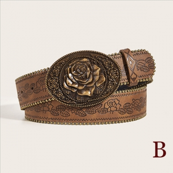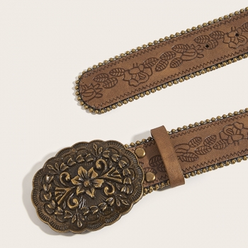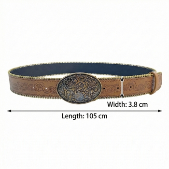 Women's Western Floral Embossed Faux Leather Belt - Y2K Boho Large Metal Buckle Waistband for Jeans/Skirt/Dress